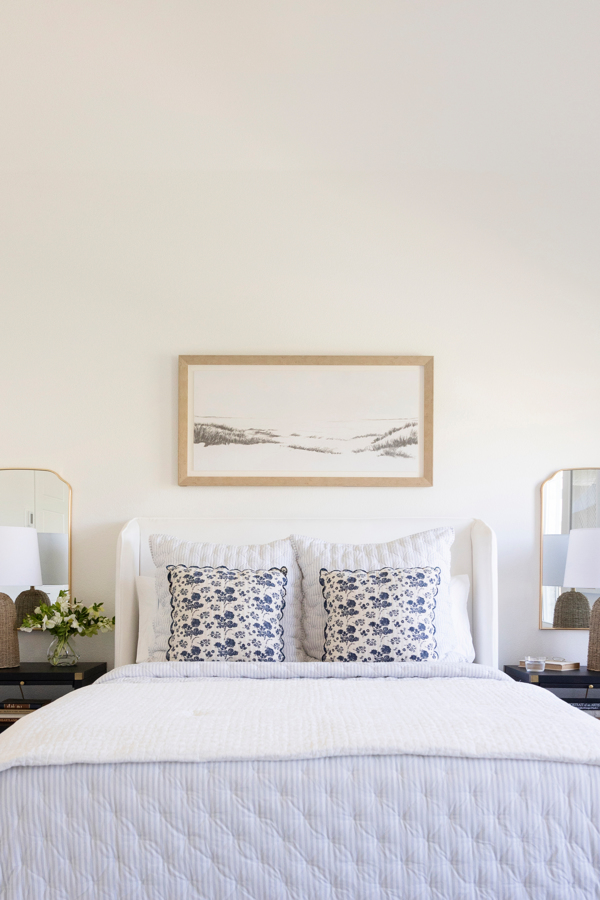 The builder painted the kitchen and bathroom cabinets blue. It didn’t feel right for the clean, airy look they wanted. We painted everything soft white, and it instantly changed the feel of the home. From there, I added custom furnishings, thoughtful decor, and plenty of personality.